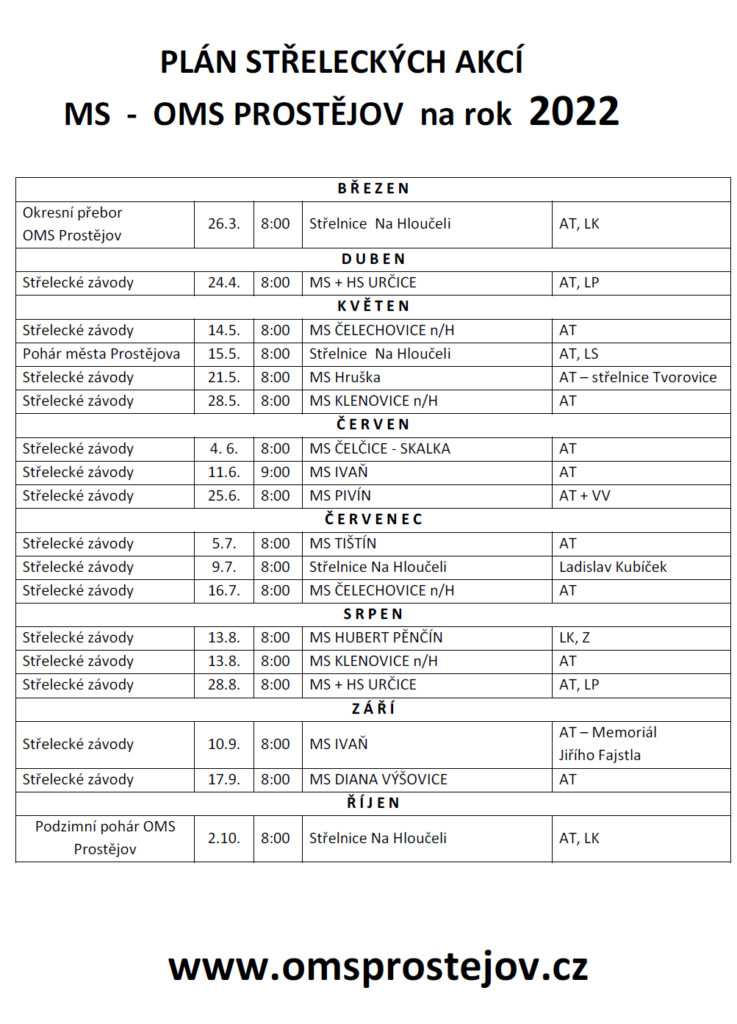Střelecké akce MS – OMS Prostějov na rok 2022